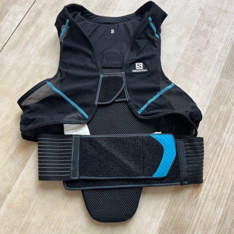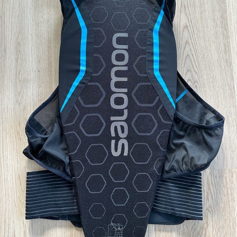 Salomon rygskjold i størrelse L. Sort model med justerbare skulderstropper og bred hofterem med velcrolukning. Designet til at bæres tæt på kroppen under fx ski, snowboard eller anden aktivitet, hvor der ønskes ekstra beskyttelse af ryggen. Let perforeret rygplade for ventilation og elastiske stropper for god pasform.