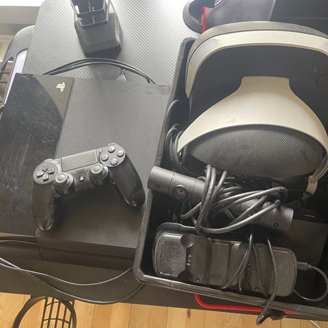 En Playstation 4 slim med en psVR headset (gen2) og nogle spil. Kan sælges separat