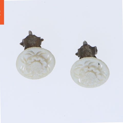 Et par blå øreringe i form af runde knapper. De har en klassisk to-huls design og er fastgjort med metalstifter og låse. Størrelsen på hver ørering er 1 cm i diameter.