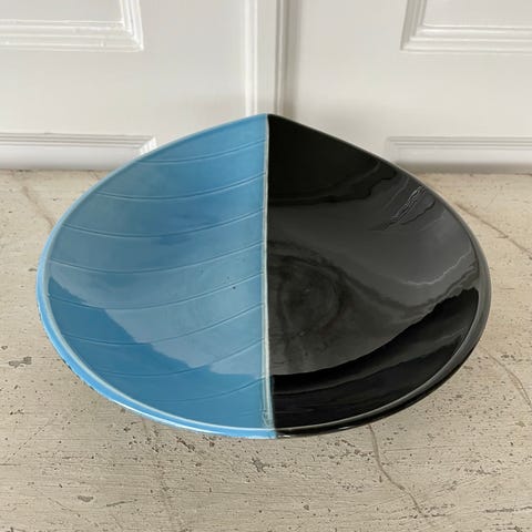 Et keramikkrus med matchende underkop. Kruset har en blå overløb med en glaseret finish og en olivengrøn base. Underkoppen matcher kruset i farve og stil. Begge dele viser tegn på let brug med mindre ridser og mærker.