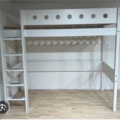 Flexa højseng til børn, i hvidmalet træ. Sengen har integreret stige i siden og sengehest hele vejen rundt for øget sikkerhed. Under sengen er der god frihøjde, som kan anvendes til leg eller opbevaring. Lameller er integreret i rammen. Velegnet til børneværelse, hvor der ønskes ekstra gulvplads under sengen.