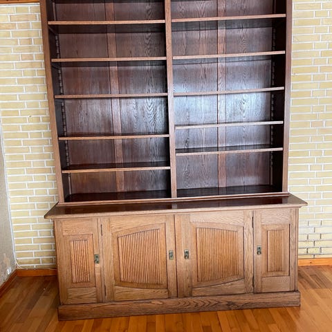 Ældre væghængt træskab i egetræ. Skabet har en buet top med udskæringer på lågen samt drejede stolper i fronten. Der er en låge med dekorativt motiv og mindre åbne hylder i siden. Velegnet som vægskab eller pynte- og opbevaringsmøbel i fx entré, stue eller køkken. Materialet fremstår som massivt egetræ.