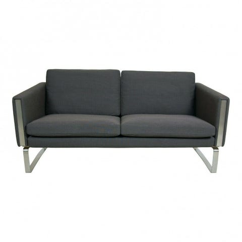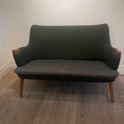 Carl Hansen CH72 sofa designet af Hans J. Wegner. To-personers sofa med polstring i blåt stof og ben samt armlænsdetaljer i træ. Kompakt model med højt ryglæn og let skrånende armlæn, egnet til stue, læsehjørne eller mindre rum. Klassisk dansk designsofa med synlige trædetaljer og fast sæde- og rygpolstring.