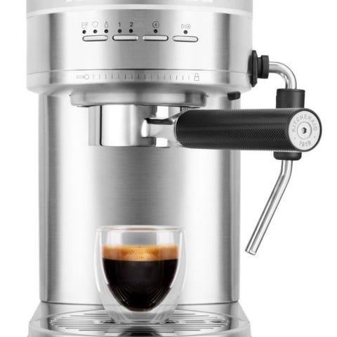 Aiviq espressomaskine med integreret kaffekværn i rustfrit stål. Maskinen har betjeningsknapper på fronten og manometer til trykvisning. Der medfølger portafilter og mælkekande, som kan bruges sammen med damprøret til opskumning af mælk. Espressomaskinen er egnet til brygning af espresso og andre kaffedrikke baseret på formalede bønner fra den indbyggede kværn.