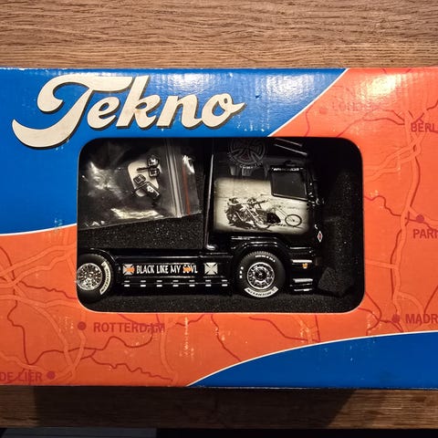 Tekno Scansped lastbilmodel. Model af lastbil med Scansped-logo på førerhus og trailer. Lastbilen er udført i flere farver med blå førerkabine og rød undervogn. Leveres i original Tekno-æske med illustrationer af forskellige trailertyper på bagsiden. Egnet som samlerobjekt eller udstillingsmodel.