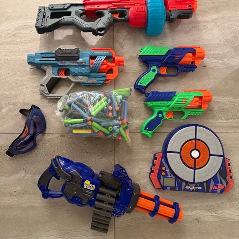 Nerf legetøjsvåben sæt til børn. Sættet består af flere plastlegetøjsvåben i forskellige farver, egnet til udendørs og indendørs leg. Produkterne er designet til børns legeskydning og rollespil. Bruges med tilhørende skumprojektiler eller vand, afhængigt af den enkelte model. Velegnet til børn, der kan håndtere legetøjsvåben under opsyn af en voksen efter behov.