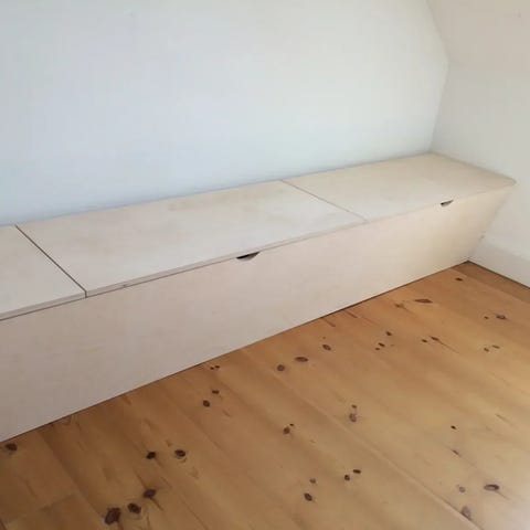 Fodlisten bliver bygget ind i bænken så den går helt ind til væggen. Bænken er med vippelåg og med valgfri ruminddeling.