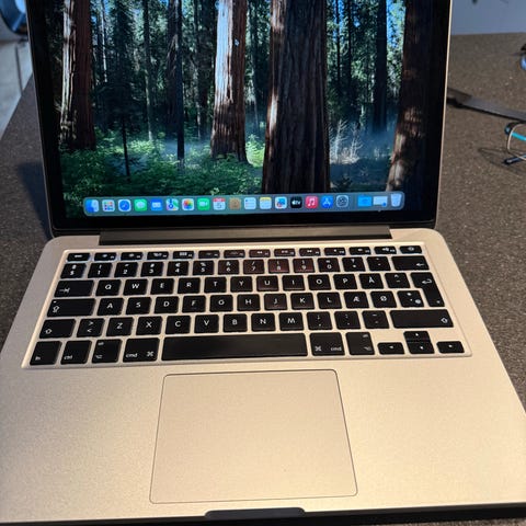 Modellen på billederne viser en 13" MacBook Pro med Intel-processor og macOS Ventura installeret. Tastaturet er med dansk layout, og kabinettet er i sølvfarvet aluminium. Skærmen er en 13-tommer skærm i widescreen-format.