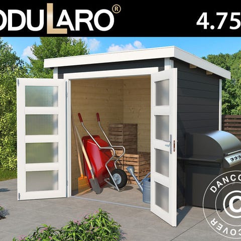 Redskabsskur i nordisk gran til haven med mere. Skuret er perfekt til at holde orden på sine haveredskaber og andet udstyr, så man kan opbevare det hele i god orden og godt beskyttet. Det kompakte redskabsskur i træ giver dig den ekstra plads, som du skal bruge for at holde styr på alle dine ting til haven. Der er lys i skuret om dagen på grund af vinduet og glas i døren. Bemærk, at døren og vinduet er malet hvide. OBS! Tagbeklædning er IKKE inkluderet. Vi anbefaler, at du undersøger det store udvalg af tagbeklædninger i dit lokale byggemarked. Modularo® er et moderne livsstilsbrand, der tilbyder holdbare kvalitetsprodukter i massivt træ og et tidssvarende design, som kan være med til at gøre dit haveliv endnu skønnere.