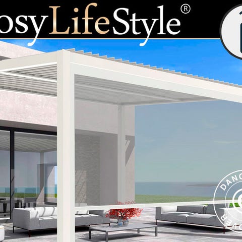 Vindtæt sidevæg med fjernbetjening til de elegante bioklimatiske San Pablo pergola pavilloner. Sidevæggen betjenes nemt og hurtigt ved hjælp af den medfølgende fjernbetjening. Sidevæggen skaber skygge og læ inde i pavillonen. Du har mulighed for at installere sidevægge på alle fire sider af pavillonen.