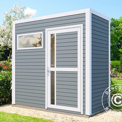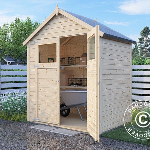 Redskabsskur i massivt FSC-certificeret nordisk gran i en stærk og holdbar panelkonstruktion til haven m.m. Skuret gør det nemt at holde orden på dine haveredskaber og andet udstyr, så det hele er opbevaret samme sted og står godt beskyttet. Vinduerne og vinduespanelet i døren sikrer dagslys inde i skuret om dagen. Alle paneler og andre dele er præfabrikerede, så der skal ikke saves. Skuret kan bygges spejlvendt! Gulv medfølger! OBS! Tagbeklædning er IKKE inkluderet. Vi anbefaler, at du undersøger det store udvalg af tagbeklædninger i dit lokale byggemarked.
