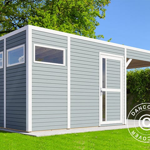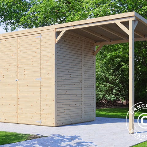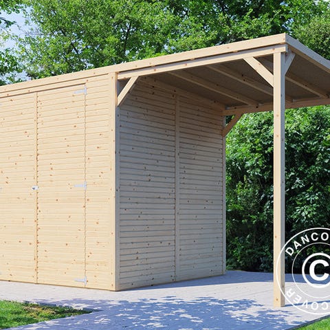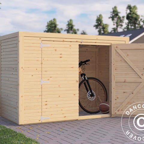 Redskabsskur i 14 mm nordisk gran med en stor dobbeltdør, der giver nem adgang. Perfekt til cykler, havemaskiner, skraldespande og meget andet. Skuret kan låses med den indbyggede lås, og det moderne paneldesign gør det nemt at placere skuret stort set overalt. Det er nødvendigt at give det ubehandlede træ træbeskyttelse, lige efter du har samlet skuret. Bemærk at skuret bliver leveret med et gulv med fer og not-samling. Designet og fremstillet i EU. OBS! Tagbeklædning er IKKE inkluderet. Vi anbefaler, at du undersøger det store udvalg af tagbeklædninger i dit lokale byggemarked.