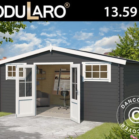 Solidt og rummeligt redskabsskur eller lille anneks i holdbart nordisk gran. Skuret er perfekt til at sørge for, at der er styr på dine haveredskaber, plæneklipper, grill og andet udstyr, så det hele bliver opbevaret ordentligt og godt beskyttet. Skuret kan også bruges som et lille anneks eller havepavillon. Den store dobbelte dør med vinduer giver nem adgang, og desuden har skuret et fint lysindfald om dagen. Placeringen af de to vinduer gør det nemt at indrette skuret med møbler og reoler. OBS! Tagbeklædning er IKKE inkluderet. Vi anbefaler, at du undersøger det store udvalg af tagbeklædninger i dit lokale byggemarked. Modularo® er et moderne livsstilsbrand, der tilbyder holdbare kvalitetsprodukter i massivt træ og et tidssvarende design, som kan være med til at gøre dit haveliv endnu skønnere.