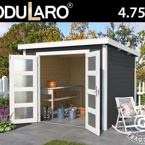 Solidt og rummeligt redskabsskur i træ eller anneks i holdbart nordisk gran. Skuret er perfekt til at holde styr på dine haveredskaber, plæneklipper, grill og meget andet, så det hele står samlet og godt beskyttet. Skuret kan også fungere som et lille anneks eller havepavillon. Den store dobbeltdør med vindue sikrer nem adgang, og du får naturligt lys indenfor i løbet af dagen. OBS! Tagbeklædning er IKKE inkluderet. Vi anbefaler, at du undersøger det store udvalg af tagbeklædninger i dit lokale byggemarked. Bemærk venligst, at rammer på dør og vinduer er malet hvide. Modularo® er et moderne livsstilsbrand, der tilbyder holdbare kvalitetsprodukter i massivt træ og et tidssvarende design, som kan være med til at gøre dit haveliv endnu skønnere.