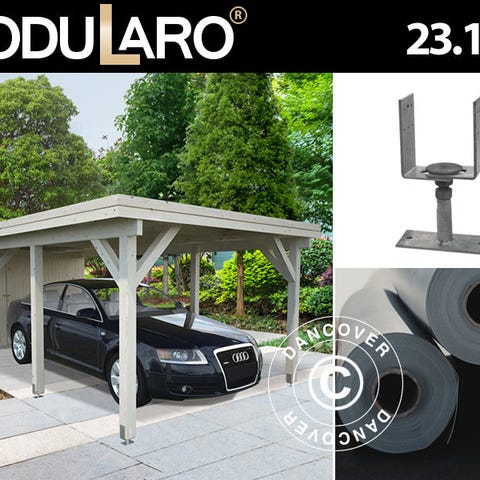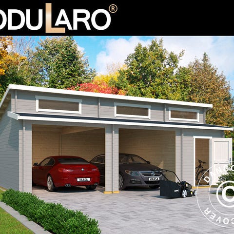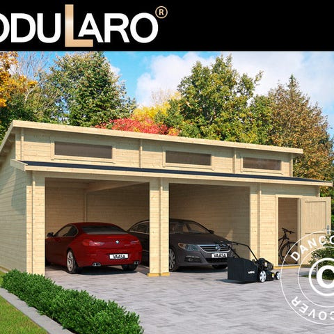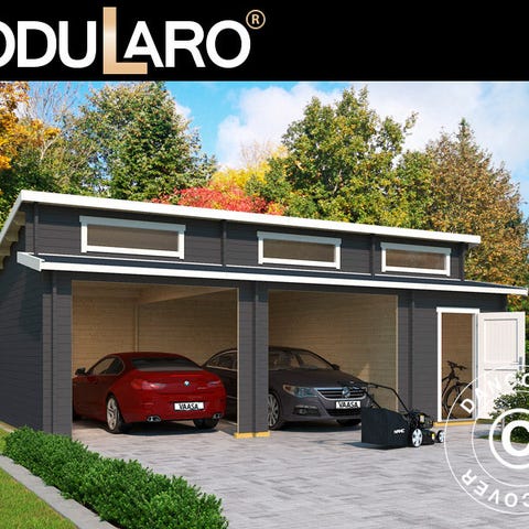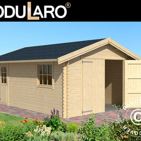 Elegant garage i massivt træ til din bil og meget andet. Garagen er perfekt til at beskytte din bil, motorcykel, cykler og måske værktøj m.m. Dobbeltdøren gør det nemt at køre bilen ind, og du kan benytte sidedøren. Sidedøren og vinduet sørger desuden for rigeligt lys i garagen om dagen. OBS! Tagbeklædning er IKKE inkluderet. Vi anbefaler, at du undersøger det store udvalg af tagbeklædninger i dit lokale byggemarked. Modularo® er et moderne livsstilsbrand med fokus på høj kvalitet, holdbarhed og komfort. Brandet byder på et stort udvalg af bygninger som skure, havepavilloner, drivhuse og bjælkehytter i massivt træ, som kan være med til at gøre dit liv i haven endnu skønnere i de næste mange år.