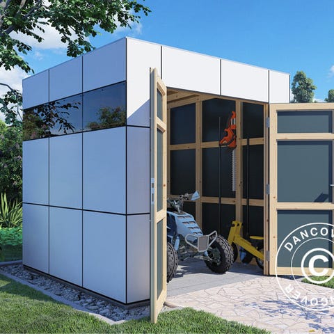 Moderne haveskur beklædt med de innovative HPL facadepaneler i arkitektonisk kvalitet. Det enestående redskabsskur er beklædt med de ekstremt holdbare 6 mm Trespa/Meteon HPL-paneler, som er vejrbestandige, farvestabile og nemme at rengøre. Det elegante skur er perfekt til at holde styr på dine haveredskaber og meget andet, så alting bliver opbevaret og står godt beskytte i flot stil. Panelerne kan monteres udad eller indad alt efter hvilken farve, du foretrækker. OBS! Taget skal inddækkes med en gummimembran i EPDM eller tilsvarende (Medfølger ikke)!