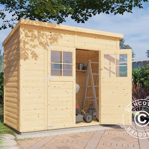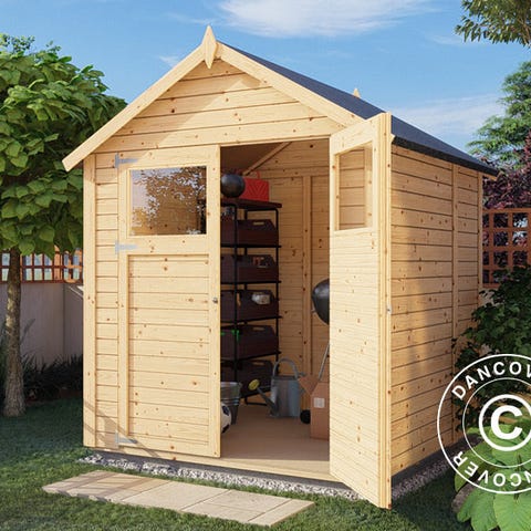 Redskabsskur i 14 mm FSC-mærket nordisk gran med en stor dobbeltdør, der sikrer nem adgang. Skuret er perfekt til at holde styr på dine haveredskaber og andet udstyr, så du kan opbevare det hele i god orden og godt beskyttet. Det moderne paneldesign gør det nemt at placere skuret stort set overalt. Det ubehandlede træ kræver, at du behandler skuret med træbeskyttelse, så snart det er samlet. Bemærk venligst at skuret bliver leveret med 16 mm fugtbestandige gulvpaneler. Designet og fremstillet i EU. OBS! Tagbeklædning er IKKE inkluderet. Vi anbefaler, at du undersøger det store udvalg af tagbeklædninger i dit lokale byggemarked.
