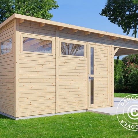 Redskabsskur i træ m/udhæng, Bertilo Cubus 3L, 5,58x2,34x2,32m, 7,65m²+5,15m², N