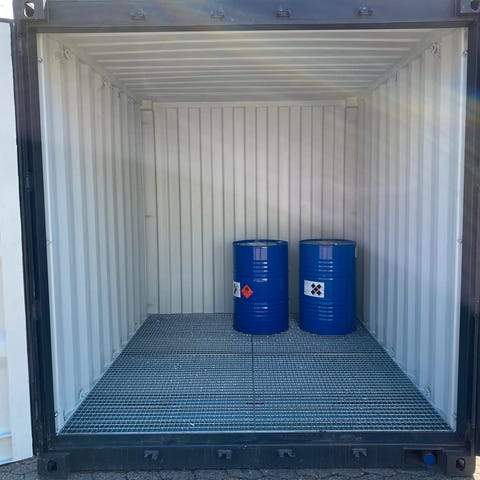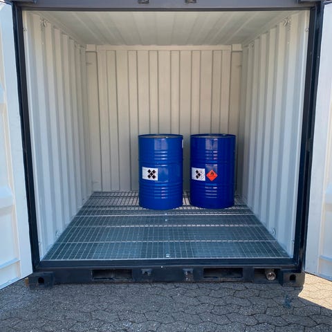 Miljøcontainer i varmgalvaniseret stål med opsamlingskar i bunden til opbevaring af olie og kemikalier for beskyttelse af miljøet. Containeren er nem at samle og adskille med de medfølgende bolte, så du altid har præcis den mængde opbevaringsplads, du har brug for.