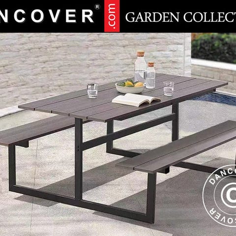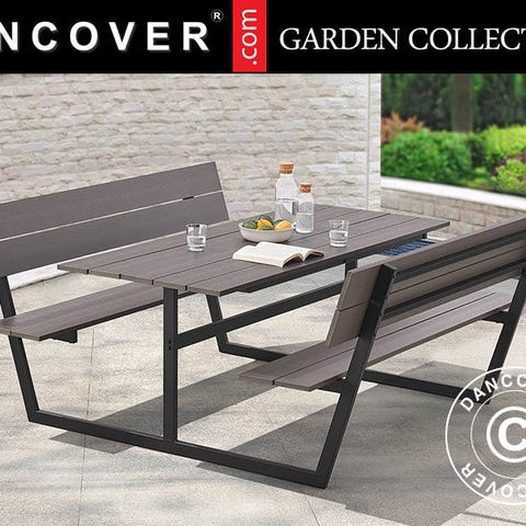 Bord/bænkesæt i sort nonwood, som er et stærkt og holdbart blandingsprodukt bestående af træ og plast. Ramme er lavet af solidt aluminium i et elegant design, som desuden gør det nemt at sætte sig og komme op igen. Denne kombination gør dette bord/bænkesæt med integrerede bænke perfekt til terrassen, haven, sommerhuset, cafeen, restauranten og forskellige institutioner. Det moderne og elegante bord/bænkesæt skaber de bedste rammer til både en hyggelig middag og andre sociale sammenkomster både indendørs og udendørs. Ingen vedligeholdelse bortset fra lidt rengøring engang imellem.