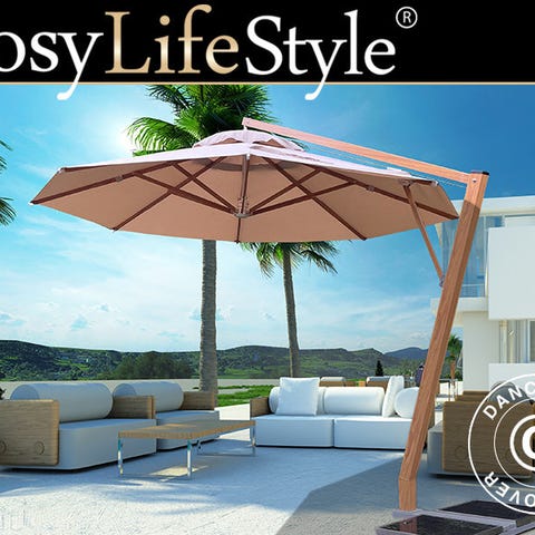 Luksus hængeparasol i et smukt, moderne design med en solid ramme i aluminium og en hejsekrank, der gør det nemt at åbne og lukke parasollen. Den eksklusive hængeparasol giver behagelig skygge samt ekstra, fleksibelt ly. OBS! Parasolfod i stål medfølger men uden ballast!