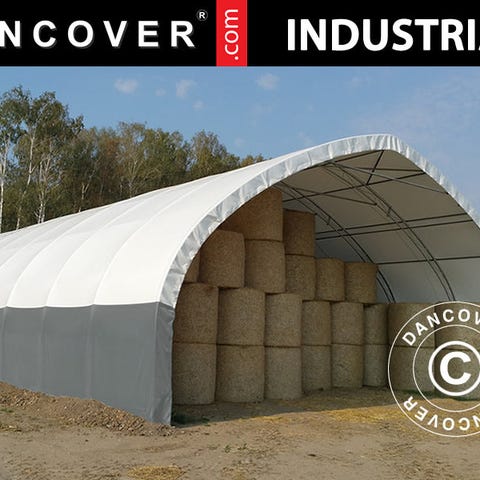 Telthal/rundbuehal i industriel styrke og kvalitet med en ramme i stærke, galvaniserede stålrør og et kraftigt, flammehæmmende 900 g/m² net-armeret PVC cover. Denne model har ikke endevægge for at give nem adgang og udluftning. Vores telthaller er et fleksibelt, økonomisk attraktivt alternativ til permanente bygninger. Som udgangspunkt har disse telthaller en snelast på 90 kg/m² og en vindbelastning på 90 km/t.
