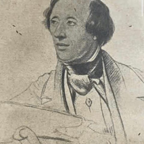 B: 25 H: 20, Formodentlig ca. 100 år gammel fotogravure forestillende H. C. Andersens Hus i Odense med tilføjelse af forfatteren selv i øverste højre hjørne og seks motiver fra hans eventyr som en nedre bort. Trykt på pap. Det opgivne mål er billedets, papmålet er 37,5 X 33 cm.