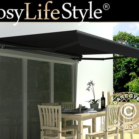 Klassisk markise til terrassen eller et andet sted, hvor du gerne vil have kølig skygge om dagen og være beskyttet mod duggen, når den falder om aftenen. Markisen er nem at betjene med fjernbetjening. Stellet består af stærkt og holdbart aluminium, og dugen er lavet af 280 g/m² polyester. Dugen er vandtæt og har en UV-modstandsdygtighed på UV50+. Den beskyttende halvkassette gør denne luksusmarkise mere holdbar end de fleste andre markiser.