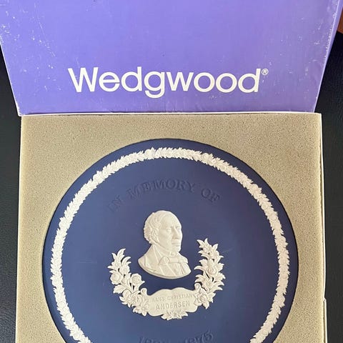 8 dele mørkeblå Wedgewood Jasper Ware. H.C. Andersen platte er i e serie på 2000 numre, og er mærket 765/2000.