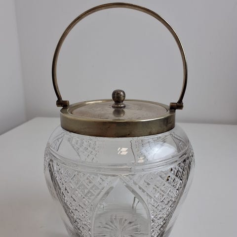 6 kiksespande samt et Wedgewood skilt. Varierende alder. 2 af kiksespandene har låg i pletsølv. 1 har uoriginalt låg. 1 har en streg, som ikke er en revne, måske en fejl.