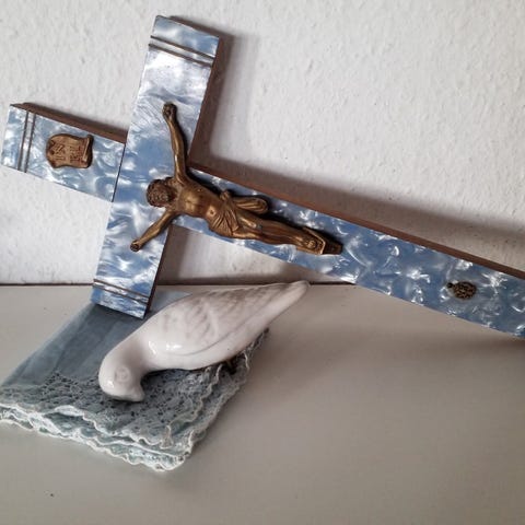 Religiøse artefakter. 2 billeder. 111 x 32 cm samt 20 x 30 cm. 8 Madonna og Jesus figurer i varrierende alder, stand og størrelser. 3 krucifiks i varierende alder, stand og størrelser, 1 madonna relief samt 2 “vejhuse” med kristus.
