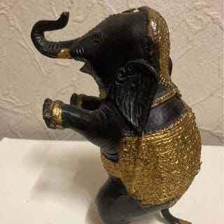 Denne dekorative figur forestiller en elefant og er lavet af metal. Den har mange udskæringer, der giver et ornamentalt udseende, og den er farvet i nuancer af blå, rød og gylden. Figuren er designet med en øsken på toppen, hvilket gør det muligt at hænge den op som dekoration. Den har en størrelse på 9 cm og er egnet til brug som dekoration i hjemmet.