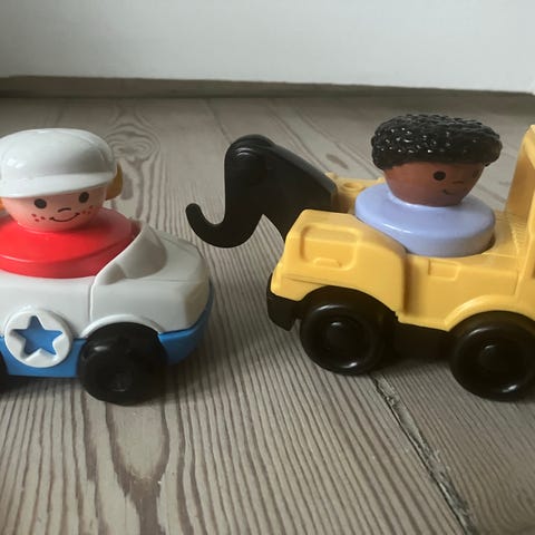 Fisher-Price Little People legetøjsbiler med figurer. Sættet består af to små biler i plast med hver sin fastmonterede Little People-figur. Bilerne er i forskellige farver og har hjul, der kan rulle, så de kan skubbes hen over gulvet.