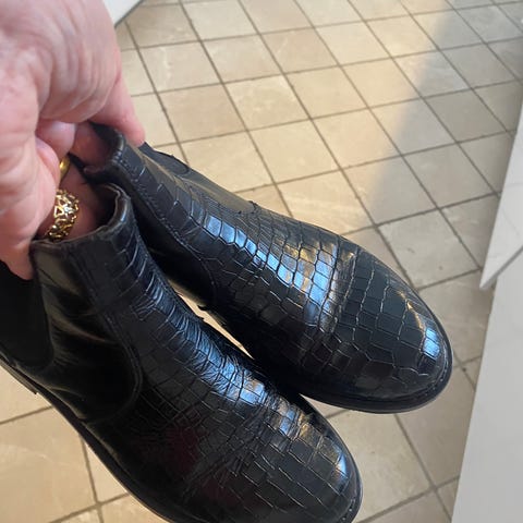 Par af sorte ankelstøvler med lynlås på siden. Støvlerne har en rund tå og en hæl med medium højde. Ydersiden er lavet af læder eller syntetisk materiale med en ru finish, og sålen har tydelige tegn på brug. Størrelse på støvlerne er 40.