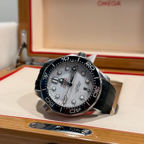 Den populære Omega Seamaster 300 M med hvid skive og sort keramisk krans. Bag den gennemsigtige safir bagkasse, kan man se det flotte automatiske, Master Chronometer Calibre 8800, som yder 55 timers gangreserve og vandtæthed ned til 300 meter.