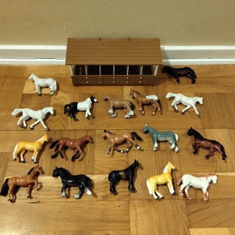 Fem små retro heste fra 1970’erne, syet i kraftig fløjl i fem forskellige farver (gul, hvid, grøn, brun og rød). Hestene måler 12 cm. Med farvestrålende tøjler og et charmerende vintage design, som gør dem ideelle både til leg og dekoration på børneværelset.