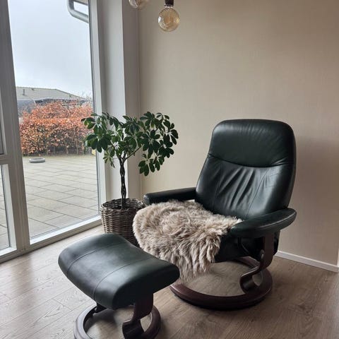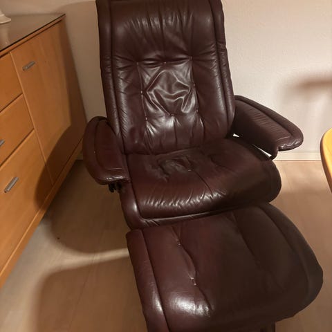 Stressless lænestol med skammel i sort læder. Sættet består af en polstret lænestol med armlæn og en matchende fodskammel. Begge dele har rund metalfod, som giver en stabil base og mulighed for drejefunktion, afhængigt af model. Egnet som hvilestol i stue, læsehjørne eller kontor, hvor der ønskes en komfortabel siddeplads med tilhørende fodstøtte.