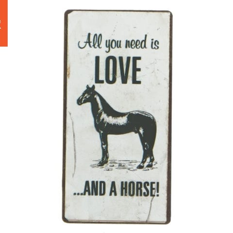 Dette er et magnetisk skilt med dimensionerne 10x5 cm. Skiltet har en sjov tekst 'All you need is LOVE... AND A HORSE!' illustreret med en hestesilhuet. Det er beregnet til at dekorere magnetiske overflader, som køleskabe eller whiteboards. Bagsiden af skiltet er fuldstændig magnetisk. Produktet er fra mærket La Finesse, som det fremgår af bagsidens stregkode.