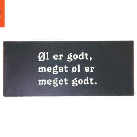 Dette er et dekorativt skilt med teksten 'Øl er godt, meget øl er meget godt.' Skiltet er rektangulært og måler 30,5x13 cm. Det har en sort forside med hvid tekst og en gylden bagside, der har to ophængskroge samt et mærke med en stregkode og teksten 'Lafinesse.eu'. Skiltet er ideelt til vægdekoration.