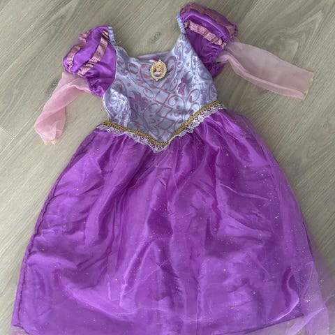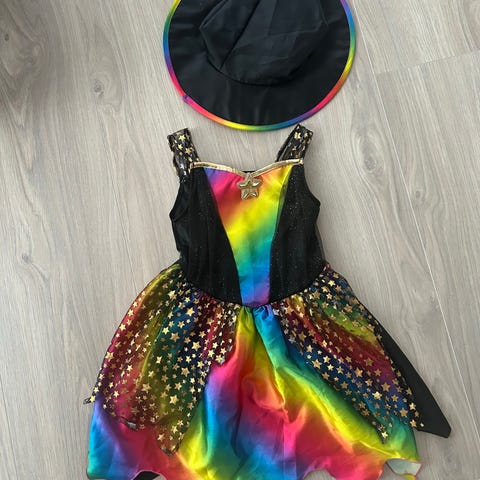 Dette er en udklædningskjole med sort og orange farver. Kjolen har et lag af sort tyl og stof på toppen og et nederdel i lag med orange og rødt tyl, som giver et flammer-lignende udseende. Fronten har dekorative knapper og et kæde-lignende tilbehør. Kjolen har lange tylærmer og et emblem på brystet.
