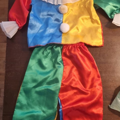 Flerfarvet klovnekostume til børn. Kostumet har korte ærmer med puffede detaljer, og er dekoreret med polkaprikker i forskellige farver. Der er store gule knapper på fronten. Nederdelen har et lilla tyl lag over en flerfarvet nederdel. Der medfølger en lille klovnehat som hårbånd.