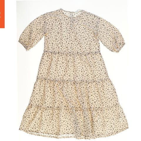 Kortærmet rød kjole lavet af et skinnende materiale. Kjolen har en rund halsudskæring og en dekorativ sløjfe på venstre skulder. Designet er enkelt med en let figursyet pasform, der når til omkring knæene. Egnet til cirka 4 til 6-årige børn.