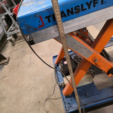 Sakseløftebord løftebord i blå lakeret stål med hydraulisk fodpumpe og krom håndtag. Udstyret med fire hjul, heraf to med bremse, samt rektangulær løfteplade. Egnet til løft og transport af kasser, sække og andet gods i lager-, værksteds- og produktionsmiljøer. Maksimal løftehøjde 180 cm, kapacitet 800 kilo. Brugt få gange 6 mdr gammelt. Nypris kr 12000.