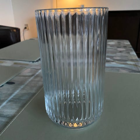 Lyngby vase med en højde på 20 cm. Den er lavet af glas, med en riflet design og kommer i en mørk farve. Vase kan også bruges til te-lys, som indikeret på pakken.