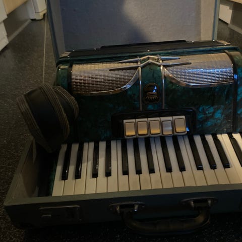 .Scandalli harmonika i sort. Instrumentet har pianotangenter og basknapper samt remme på fronten. Leveres i foret kasse med rød indvendig polstring, som beskytter harmonikaen under opbevaring og transport. Velegnet til brug i øve- og spillesituationer, hvor der ønskes et traditionelt klaverbaseret harmonikainstrument.