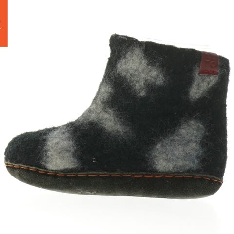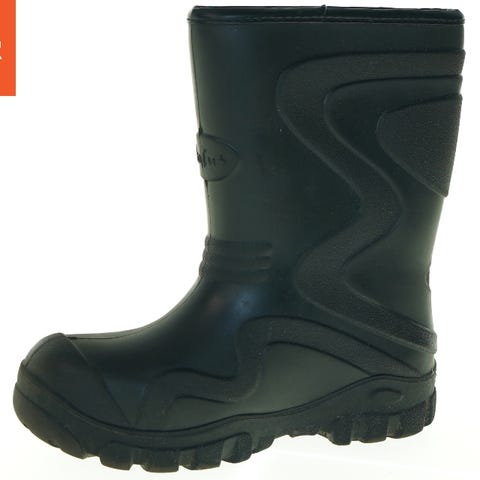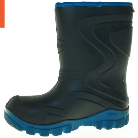 Børnestøvler i størrelse 21 med to velcro-lukninger for nem justering og komfort. Støvlens overdel er i en kombination af læder og tekstilmateriale, og den har en robust gummisål designet til godt greb. Indvendigt er støvlen foret med blødt fleece for ekstra varme og komfort. Støvlerne har detaljer som 'TEX' branding på siden, hvilket kan indikere vandafvisende materialer.