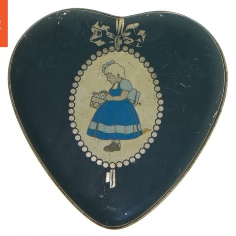 En hjerteformet metalæske med dimensionerne 9,5x9,5 cm. Æsken har en mørkeblå farve med gyldne detaljer på kanten og et dekorativt billede placeret centralt på låget, indrammet af en gylden kant. Den åbner på midten for opbevaring af små genstande. Æsken er lavet af letmetal og viser et traditionelt design.