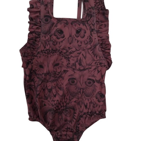 Badedragt med blomster mønster i lyse farver, primært lilla og gul. Den har flæsedetaljer ved skuldrene og benene.