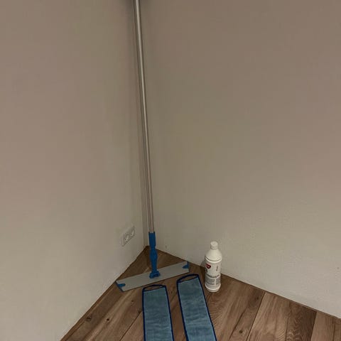 Sættet består af en fladmoppe med microfiber-overflade og en spand med integreret klemmekurv, der hjælper med at vride moppen let. Microfibrene gør det enkelt at fjerne snavs, og sættet er velegnet til både klinker og glatte overflader som parket og laminat.