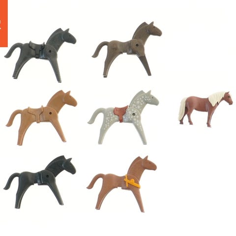 Dette er et sæt af 7 Playmobil heste i forskellige farver og designs. Hestene er ca. 11 cm lange og er ideelle til leg eller samling. De kommer i en plastpose, der er mærket 'Playmobil heste 7 stk'.